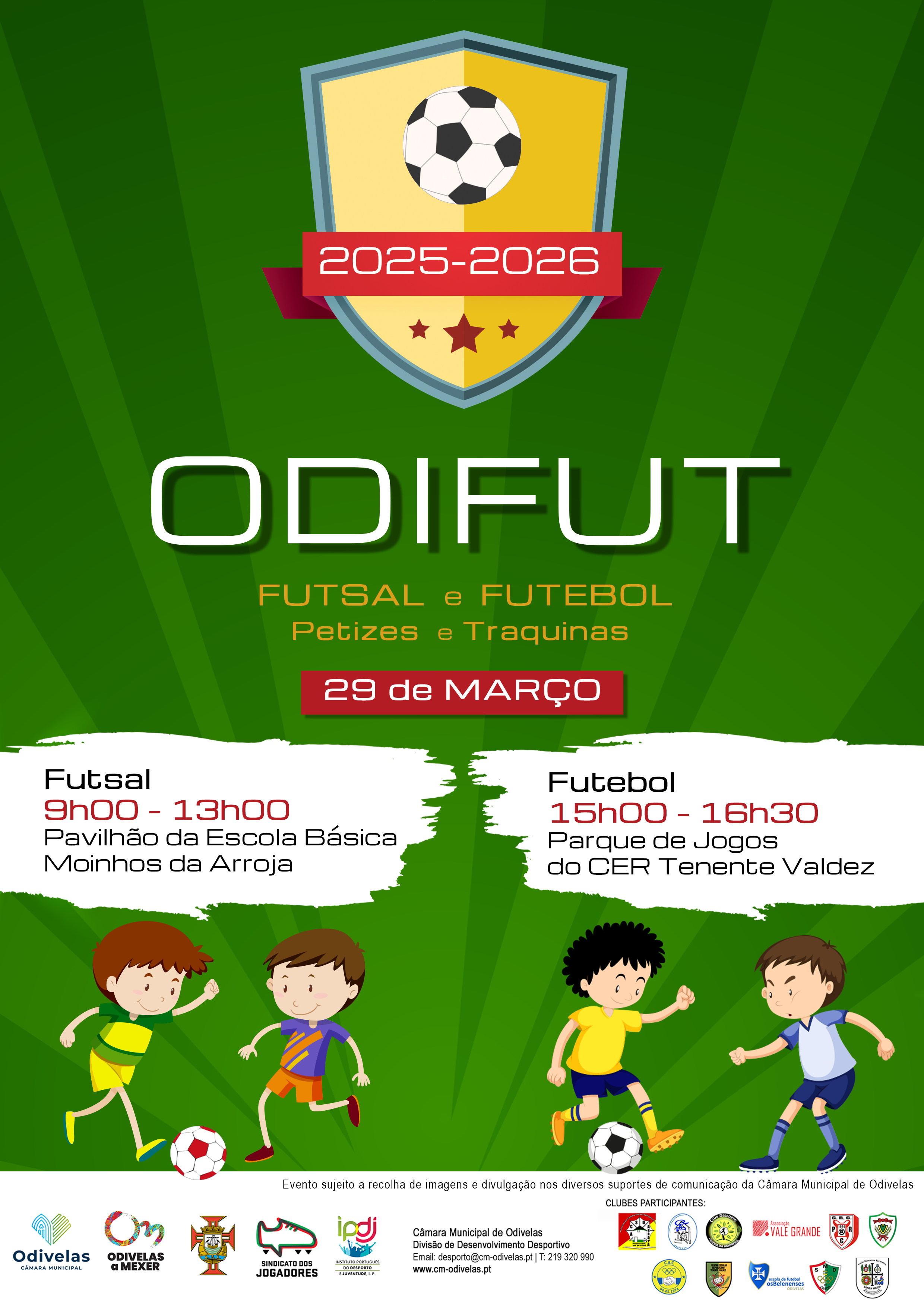 Realização do projeto “ODIFUT”, promovendo o desenvolvimento da prática desportiva nas modalidades de Futsal e Futebol, com o objetivo de contribuir para a promoção da atividade física dos escalões de Petizes (Juniores G | Sub6/Sub7 | nascidos em 2019 e 2020) e Traquinas (Juniores F | Sub8 /Sub9 | nascidos em 2017 e 2018), através de jogos de caráter lúdico/competitivo, entre setembro de 2025 e junho de 2026.